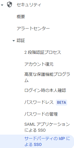 Google Workspaceの管理コンソールに管理者用アカウントでログオンし、「セキュリティ」→「認証」→「サードパーティのIdPによるSSO」へと進みます。