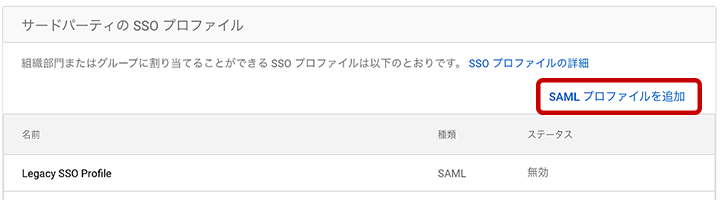 1. サードパーティの SSO プロファイルの「SAMLプロファイルを追加」をクリックします。