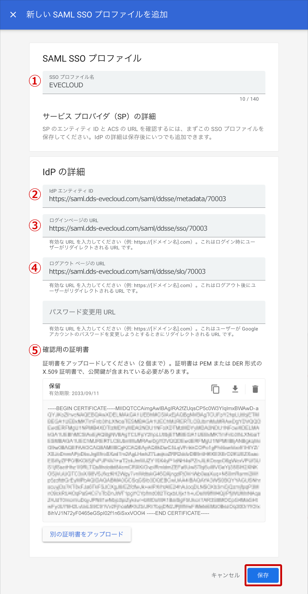 ➄IdPの詳細の「確認用の証明書」に、EVECLOUDの管理ツールからダウンロードしたX.509証明書をアップロードします。