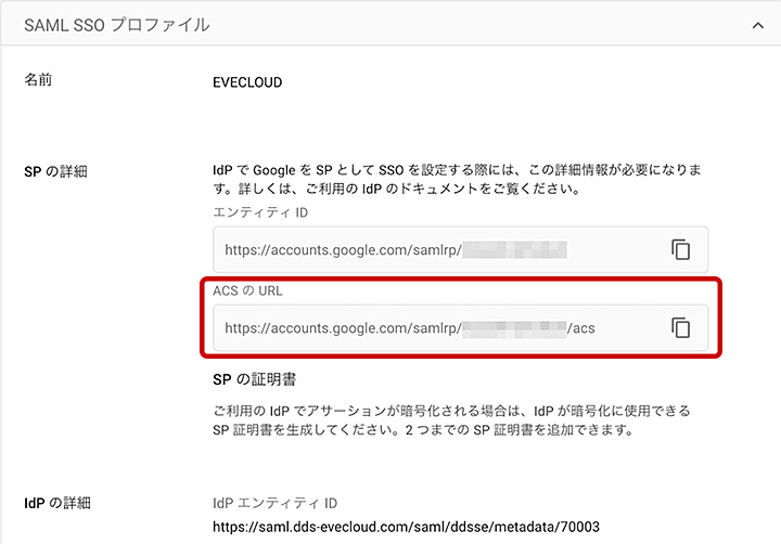 5. SPの詳細の「ACSのURL」をコピーし控えておきます(EVECLOUDへのシングルサインオン設定で利用します)。