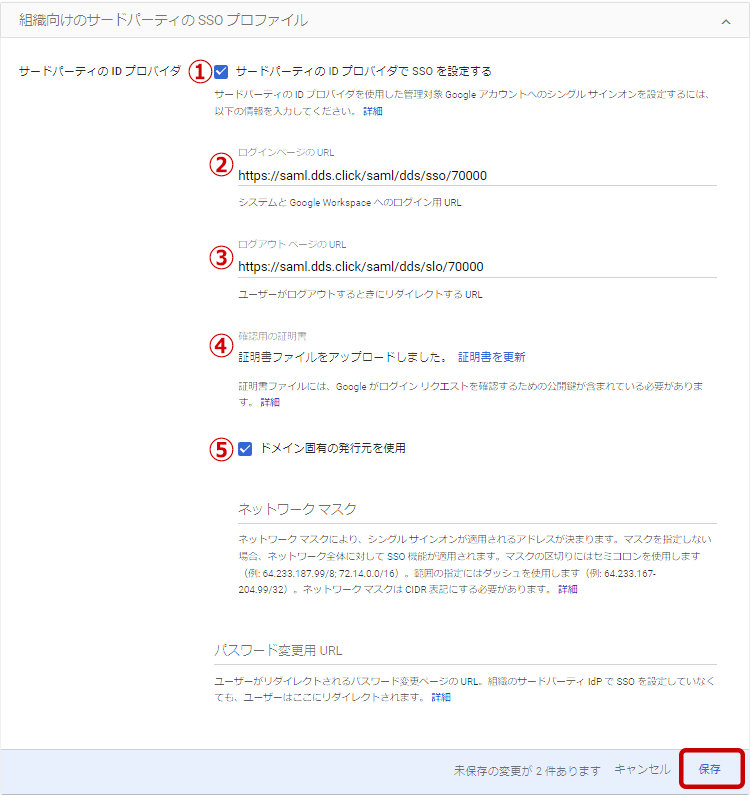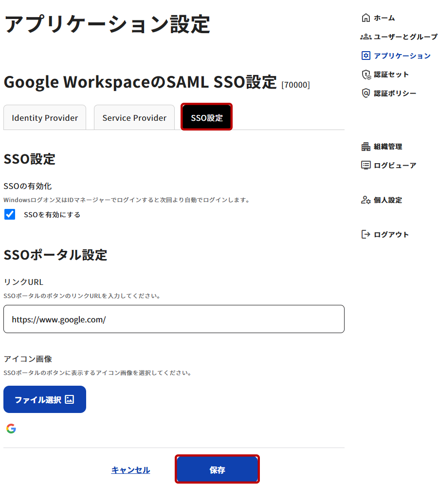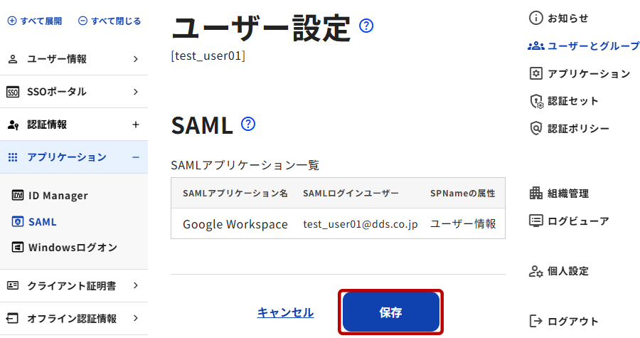 3. [保存]ボタンをクリックし登録内容を保存してシングルサインオンの設定は完了です。
