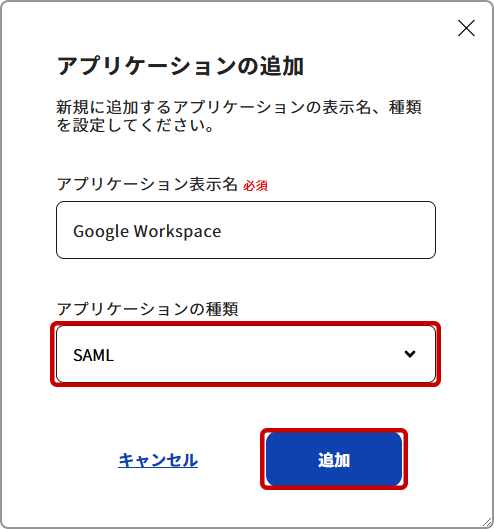 1. はじめに[アプリケーションの管理]ページにてアプリケーションの登録を行います。登録の際、[アプリケーションの種類]は[SAML]を選択します。