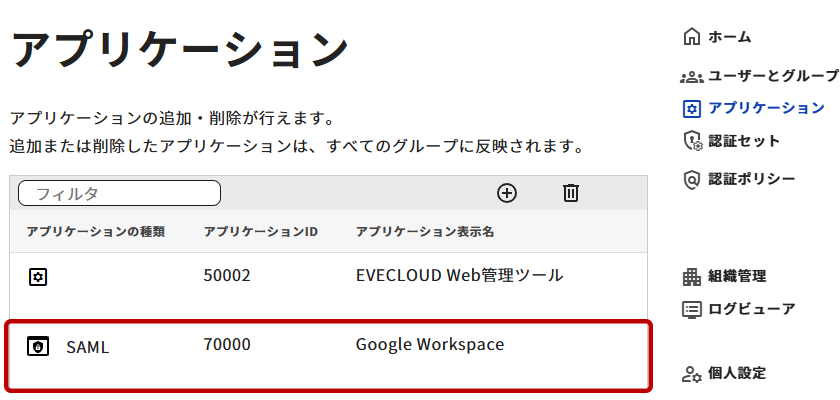 管理ツール>アプリケーションの管理にて、作成したアプリケーション「Google Workspace」を選択します。