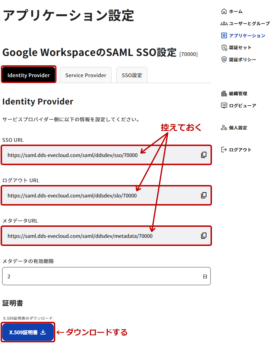 メタデータURLEVECLOUDのSAML IdPメタデータをダウンロードするURLです。