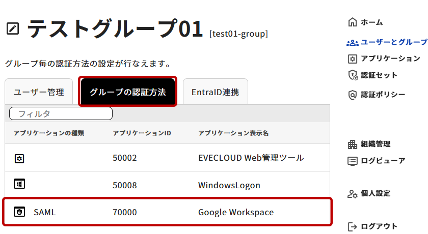 グループ管理から該当のグループを選択し、[グループの認証方法]タブにて対象のアプリケーションを選択し設定を行います。