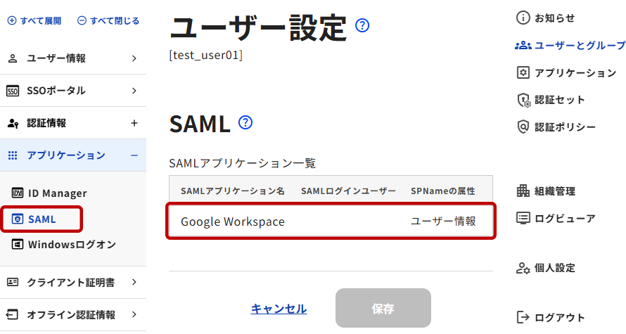 1. EVECLOUD管理ツールにて、「グループの管理」>「ユーザー管理」からSAMLログイン設定をさせたいユーザーを選択し、「ユーザー設定」画面を開きます。左メニューの[SAML]を選択し、SAMLアプリケーション一覧から登録済みのSAML「Google Workspace」を選択します。