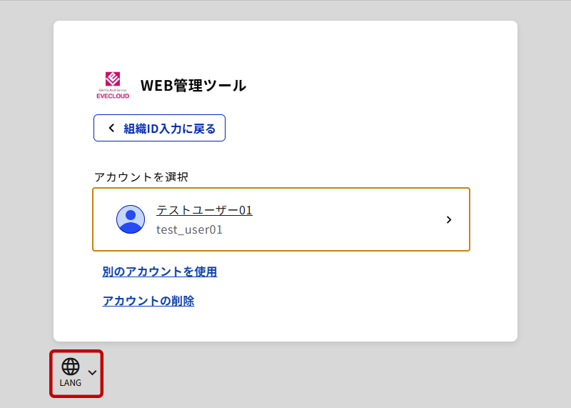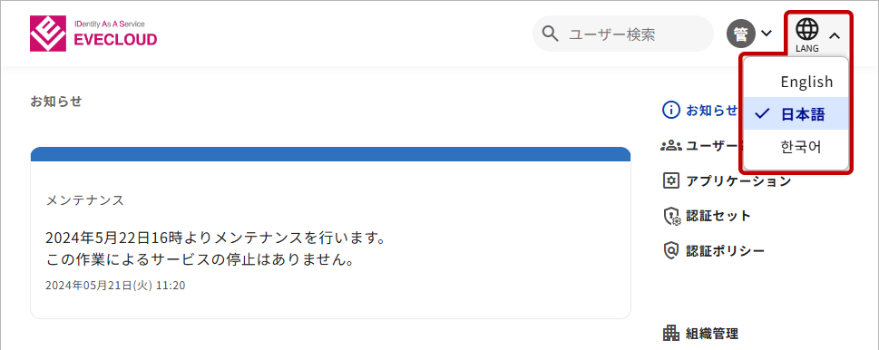 EVECLOUDの認証画面や管理ツール(または、ポータルサイト)の言語を切り替えることが可能です。基本的には、ブラウザの言語設定から判断し、対応した言語になります。