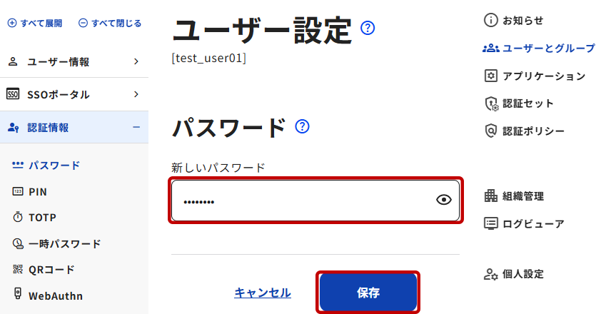 3. 「新しいパスワード」欄にパスワードを入力し、[保存]ボタンをクリックします。