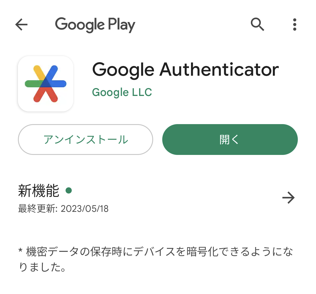 Google Play Storeより「Google Authenticator」をインストールしてください。