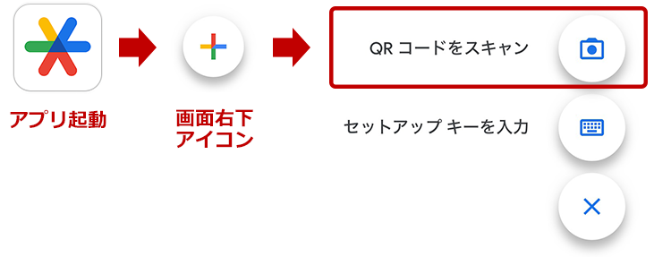 アプリ画面右下のプラスアイコンから「QR コードをスキャン」を選択し、デバイスカメラの起動を確認後、上記で表示させたQRコードをデバイスカメラで読み撮ります。