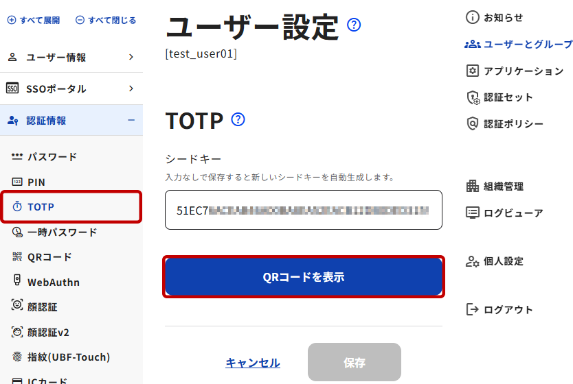 3. [QRコードを表示] ボタンをクリック後、TOTP設定用のQRコードが表示されます。