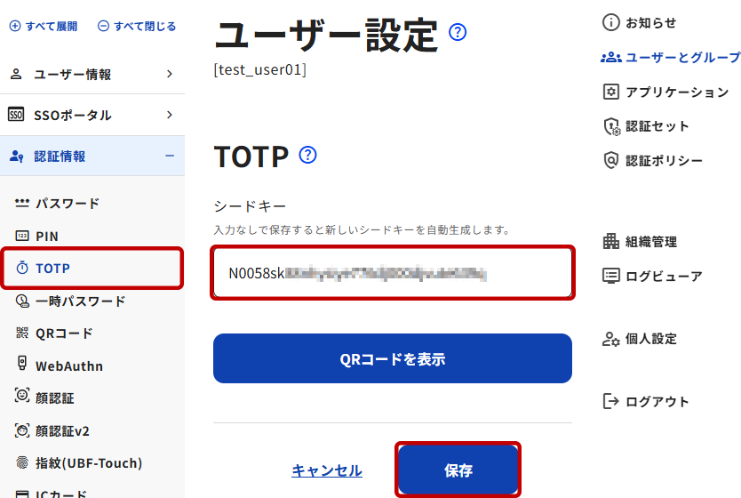 [注意事項]不用意にシードキーを新たに生成した場合、既に登録済みの認証できなくなりますので注意が必要です。シードキーは、TOTPシードキー欄を空欄にした後、設定を保存した場合に新しいシードキーが生成されます。