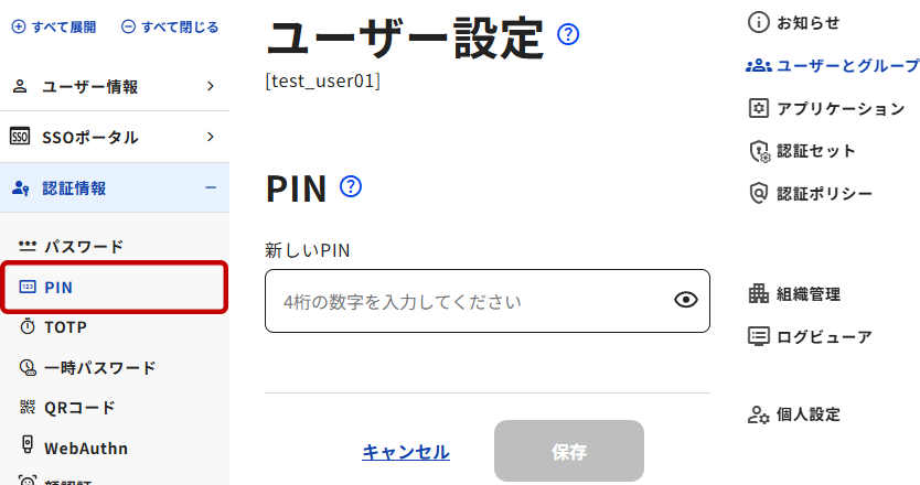 2. 「ユーザー設定」ページにて、左カラムメニューから[PIN]を選択します。