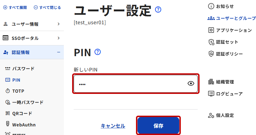 3. 「新しいPIN」欄にPINコードを入力し、[保存]ボタンをクリックします。