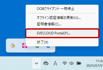 EVECLOUDクライアントがインストールされている端末では、タスクトレイから管理ツール(ポータルサイト)の表示が可能です。