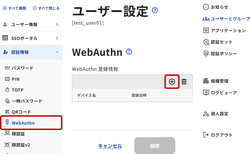「WebAuthn登録情報」一覧右上の[+]アイコンを押します。