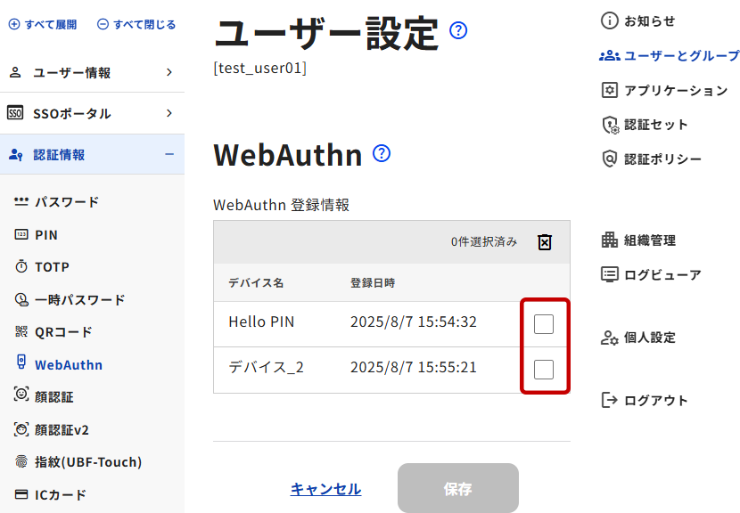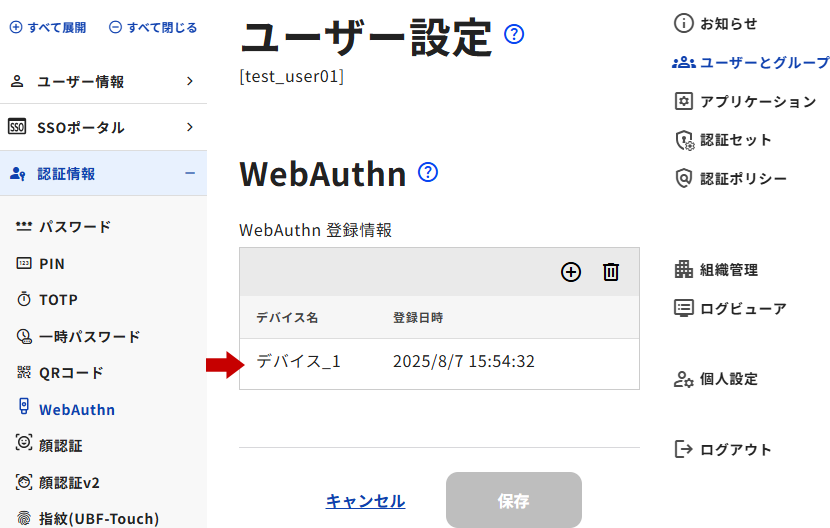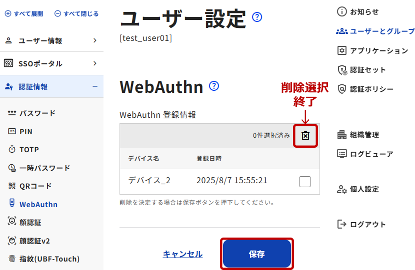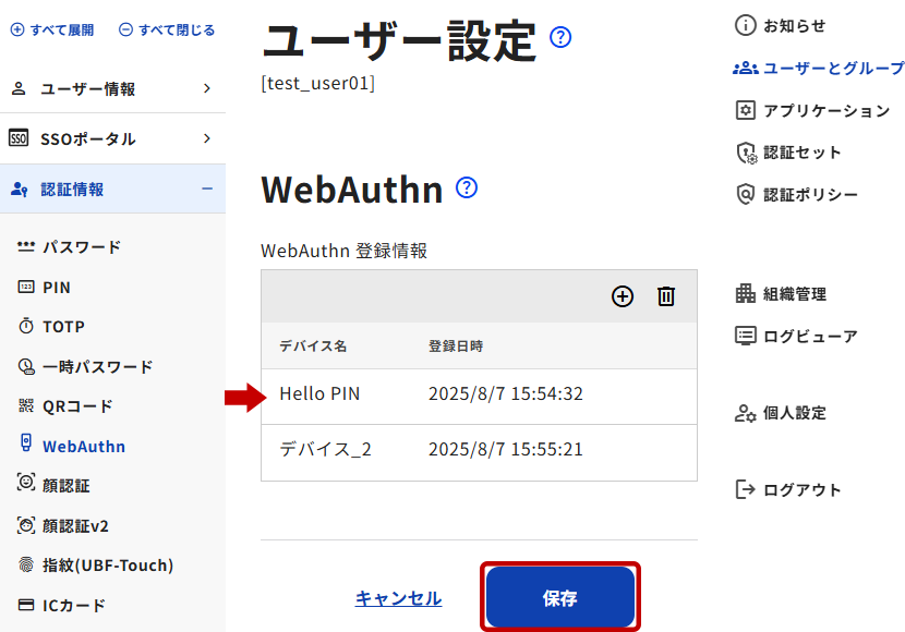 [保存]ボタンをクリックしてWebAuthnの登録情報を更新します。
