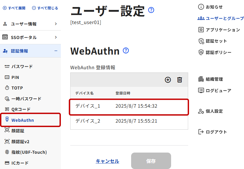 7. 「WebAuthn登録情報」一覧にデバイスが登録されました。