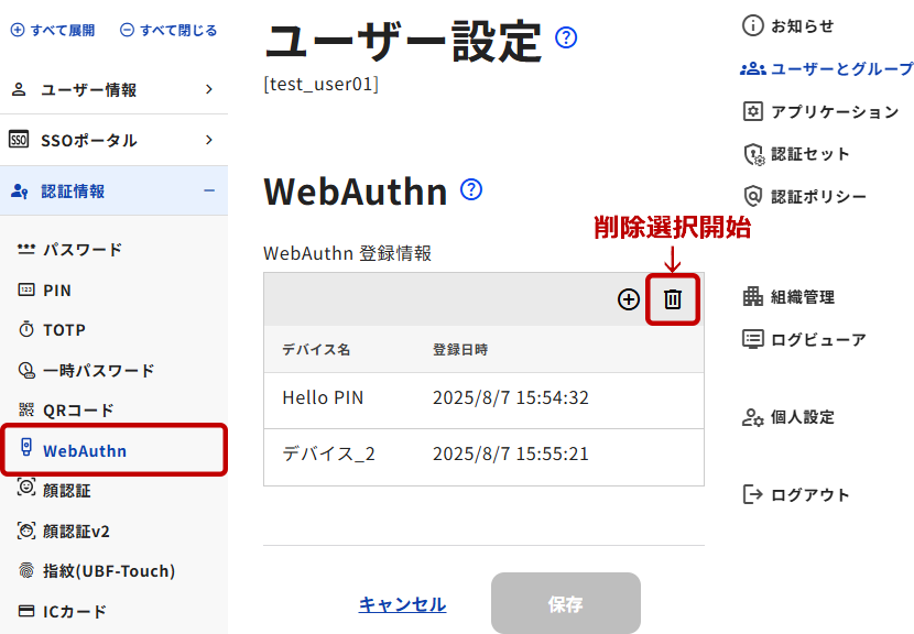 3. 削除候補を選択し、リストにチェックが入ると[削除] ボタンが表示されるので、[削除] ボタンをクリックしてWebAuthn登録情報の削除を完了させます。