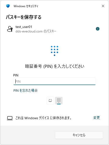Windowsセキュリティの画面が起動します。パスキーの保存先を変更する場合には「変更」をクリックします。