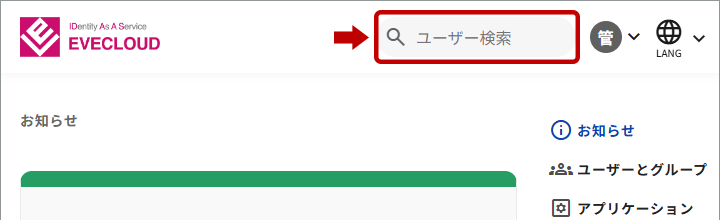 1. 画面右上の[ユーザーを検索] 窓の入力欄に任意の文字列を入力し、[enter]キーで検索を実行します。