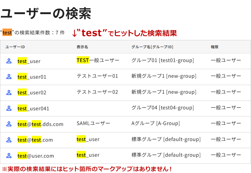 グループ管理者グループ管理者の所属・管理するグループに登録済みのユーザーが、グループ内から検索可能です。
