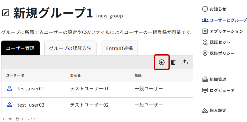 1. 任意のグループの[ユーザー管理]タブを開き、ユーザー一覧右上の[+]アイコンをクリックします。