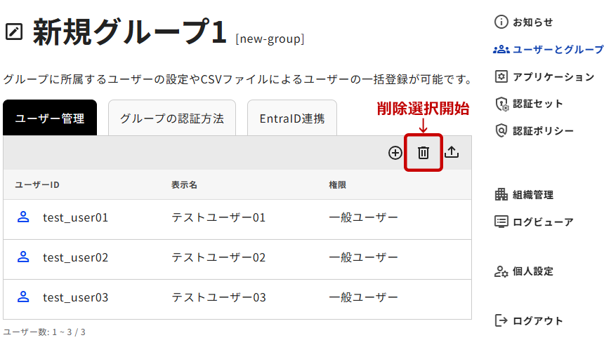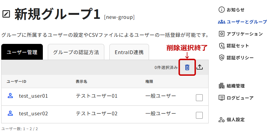 1. 登録済みのユーザーを削除する場合は、ユーザー一覧の右上にあるdeleteアイコンをクリックします。