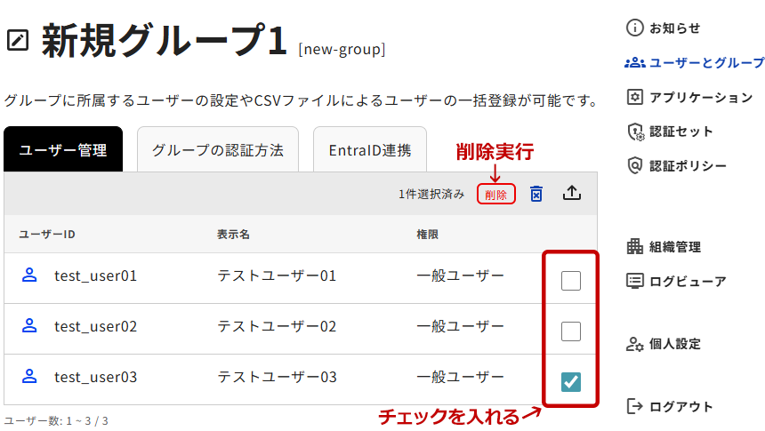 2. ユーザー一覧の右端にチェックボックスが表示されるので、削除したいユーザーにチェックを入れます。リストにチェックが入ると[削除]ボタンが表示されるので、[削除]ボタンをクリックしてユーザー削除を実行させます。
