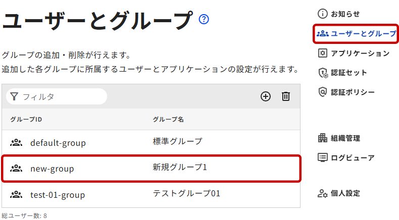 1. 右メニューから[ユーザーとグループ]を選択し、「ユーザーとグループ」ページを開きます。