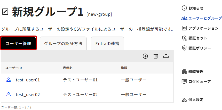 一覧の[ユーザー管理]タブを選択することで、グループに所属するユーザーの一覧が表示されます。