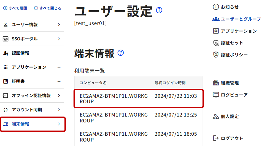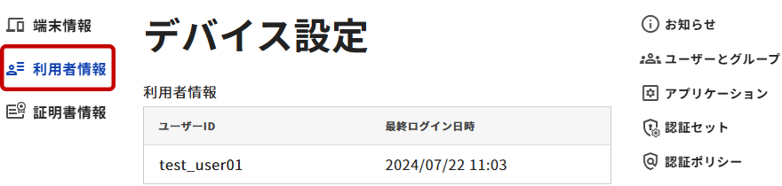 2. 「ユーザー設定」ページにて、左カラムメニューから[端末情報]を選択します。