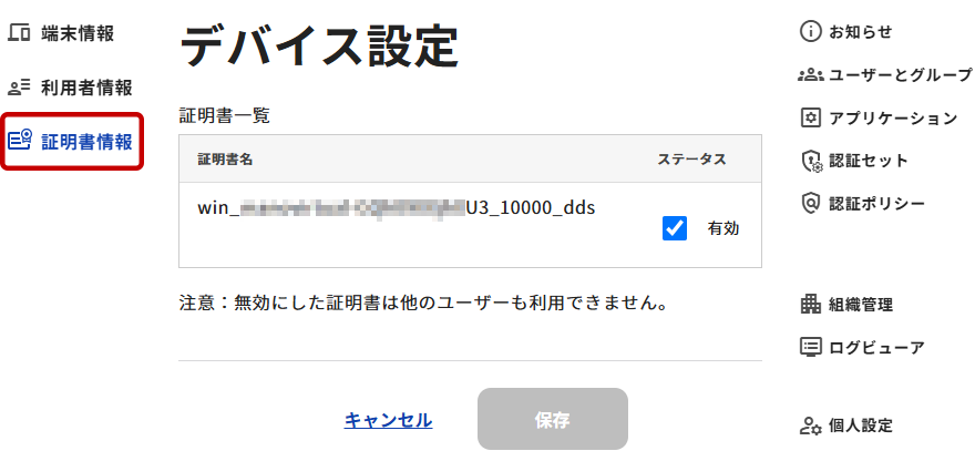 証明書情報端末で利用されている証明書情報が確認でき、有効/無効の設定が可能です。