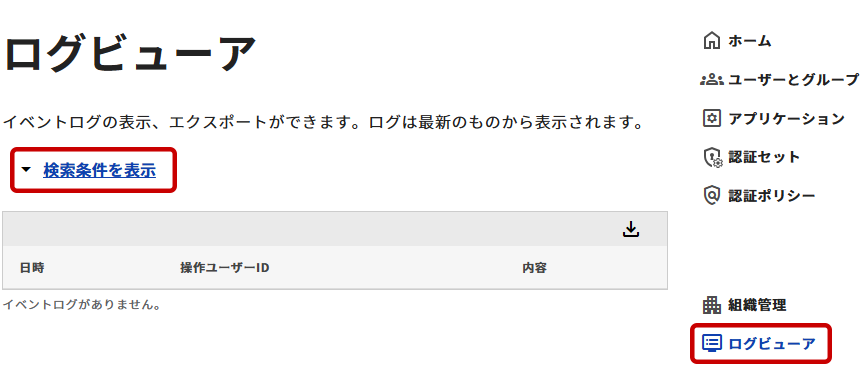 組織全体のイベントログを表示します。ログは最新のものから表示され、検索による絞り込みやCSVによるエクスポートが可能です。