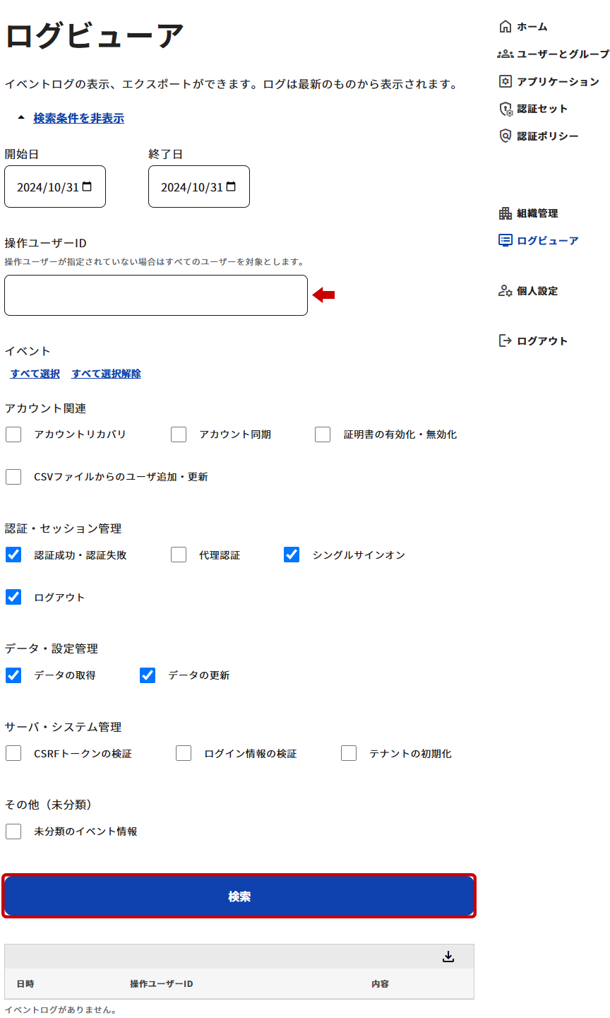 「操作ユーザーID」欄に特定のユーザーIDを入力して絞り込むことが可能です。