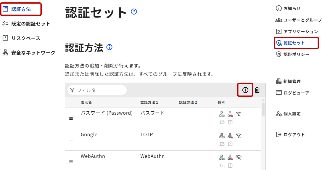 1. 右メニューから[認証セット]を選択し、認証方法画面を開きます。登録済み認証方法一覧 右上の[+]アイコンをクリックし、新規認証方法の追加を開始します。