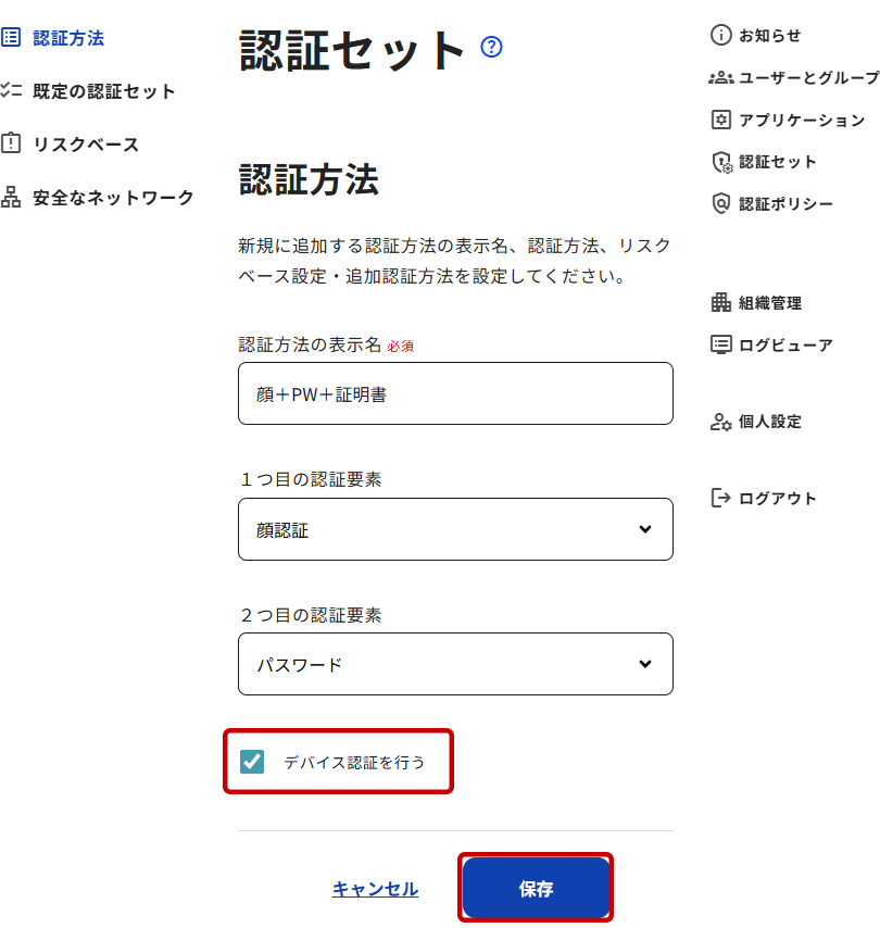 2. 新規認証方法設定画面が表示されるので、表示名や任意の認証方法を設定後、「デバイス認証を行う」にチェックを入れます。