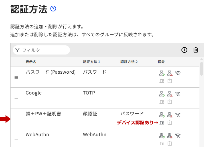 3. 新規追加された認証方法がリストに追加されました。備考欄にてアイコン表示で「デバイス認証」が設定されていることが確認できます。