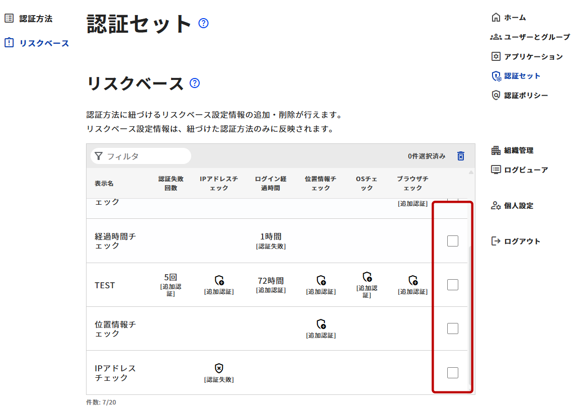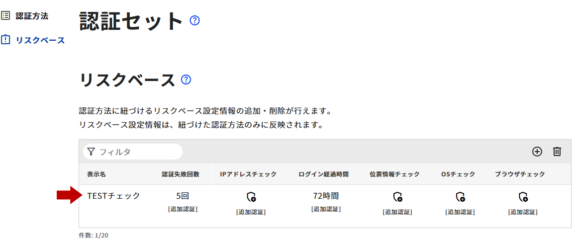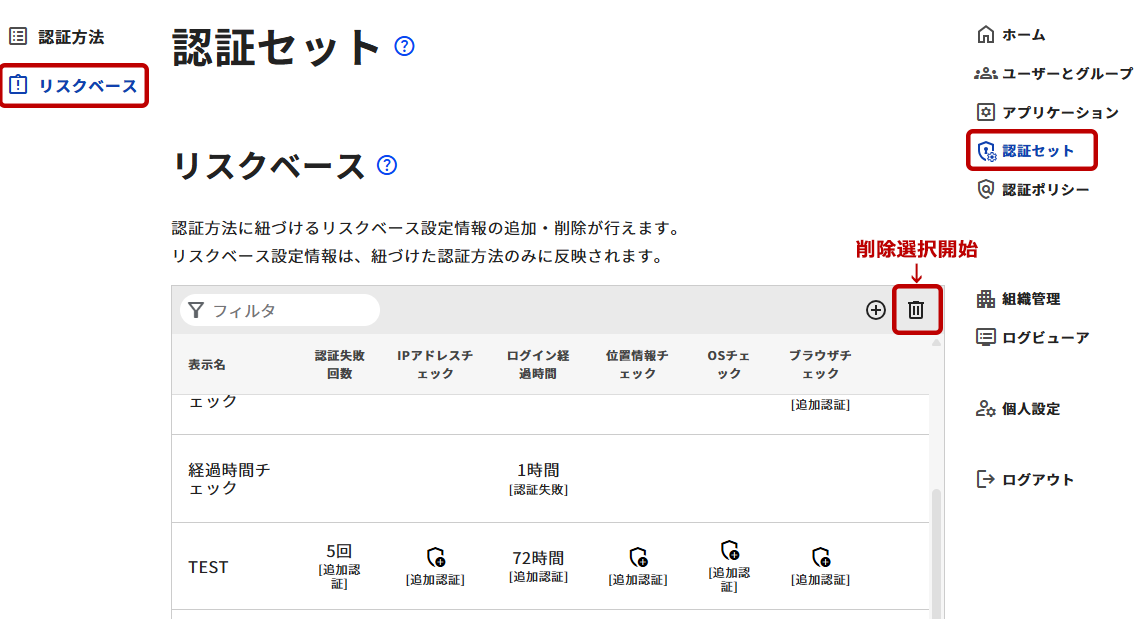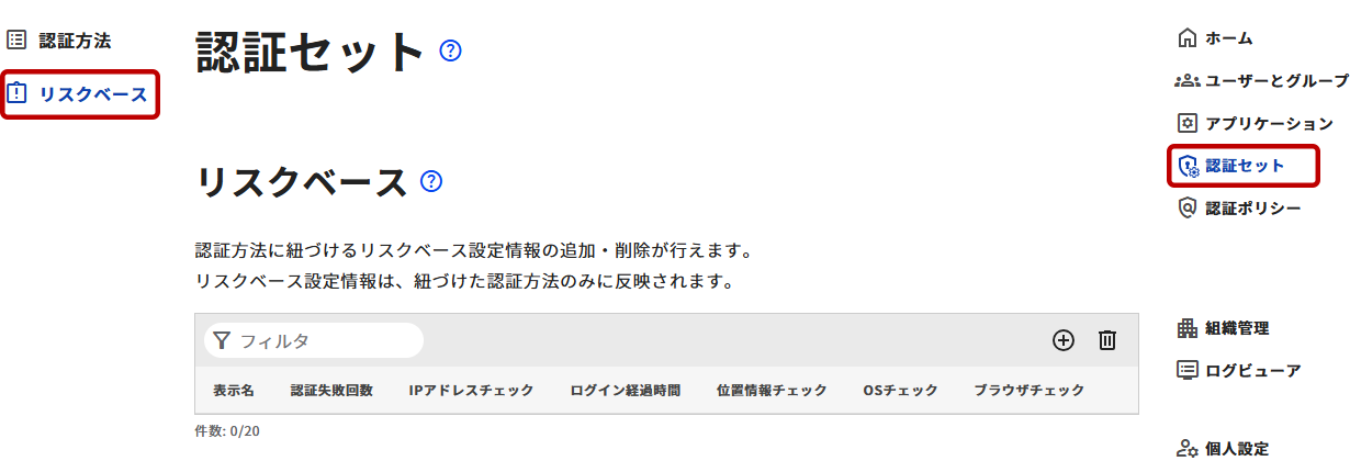 - 管理ツールの右メニューから[認証セット]を選択します。認証セット画面の左メニューから[リスクベース]を選択します。