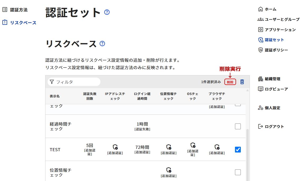 - 削除したいリスクベースを選択し、リストにチェックが入ると[削除]ボタンが表示されるので、[削除]ボタンをクリックしてリスクベースの削除を完了させます。