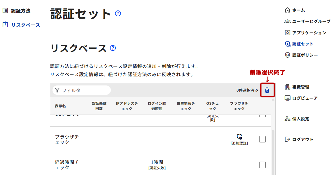 - リストの右端にチェックボックスが表示され、削除したいリスクベースを選択することができるようになります。