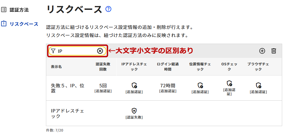 設定した回数以上、認証を失敗している場合にリスクと判定します。IPアドレスチェック アクセス経験のあるIPアドレス以外からのアクセスがあった場合にリスクと判定します。 経過時間チェック 「リスク判定しない」以外の設定を行った場合、「経過時間」(1~1000時間以内)の設定が必須となります。