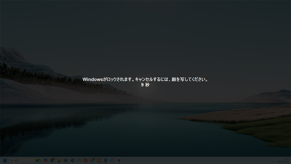 検出(または認証)失敗&リトライ後に、キャンセル可能時間が画面にカウント表示します。画面指示通りにキャンセルを行った場合、WEBカメラからの顔撮影が再開→顔の検出が成功後(認証がONの場合は顔認証も成功)、顔検出による離席監視が再開&継続します。(下記画面表示は、マルチディスプレイの場合すべてのディスプレイに表示します)
