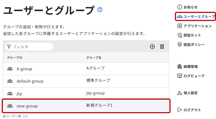 - 右メニューから[ユーザーとグループ]を選択し、「ユーザーとグループ」ページを開きます。