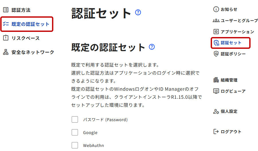 - 右カラムメニューから[認証セット]を選択します。認証セット画面の左カラムメニューから[既定の認証セット]を選択します。