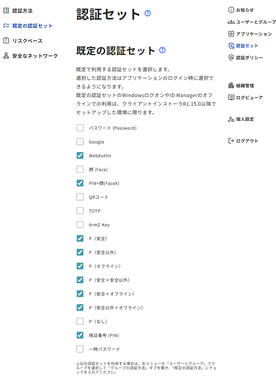 - こちらで設定した内容は、認証画面の認証方法選択内容に反映されます。グループのアプリケーション設定で「既定の認証セット」をONに設定した場合に限ります。