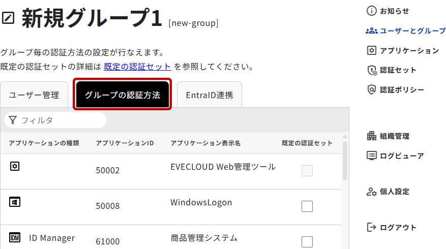 | アプリケーション | 新規アプリケーションは「既定の認証セット」が「ON」の状態で追加されます。 グループの「グループの認証方法」タブ内、アプリケーション一覧にて確認ができます。 |