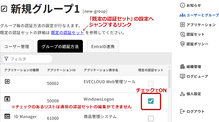 - 一覧右端のチェックボックスにチェックが入ってる場合は、「既定の認証セット」が「ON」の状態です。「ON」の状態では、グループ毎の「アプリケーション認証セット」の編集は出来ません。
