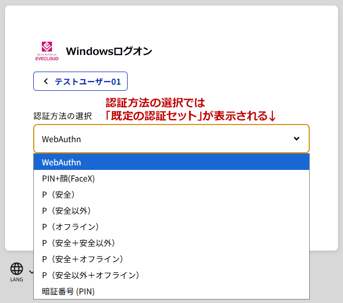 認証画面では、「既定の認証セット」で設定された認証セット一式から認証方法を選択できます。