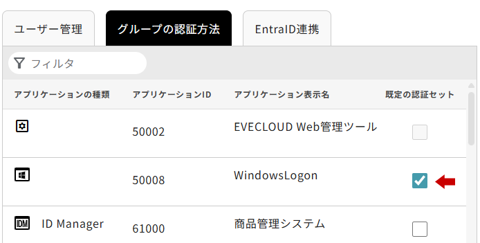 「既定の認証セット」は、管理ツール以外のアプリケーションに設定可能です。「グループの認証方法」タブ内で設定が行えます。